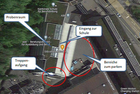 Unser Probenraum:Kantonale Schule für BerufsbildungSchmiedestrasse 13, 5400 Baden, Schweiz Abends ist parken gemäß dem Bild links möglich. © Info@bigbandbaden.ch |